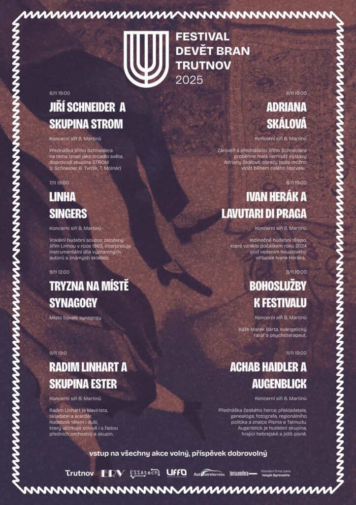 Rádi předáváme pozvání na letošní ročník festivalu židovské kultury Devět bran 2025 v Trutnově. Od 6. do 11. listopadu zvou pořadatelé na bohatý duchovní i kulturní program.