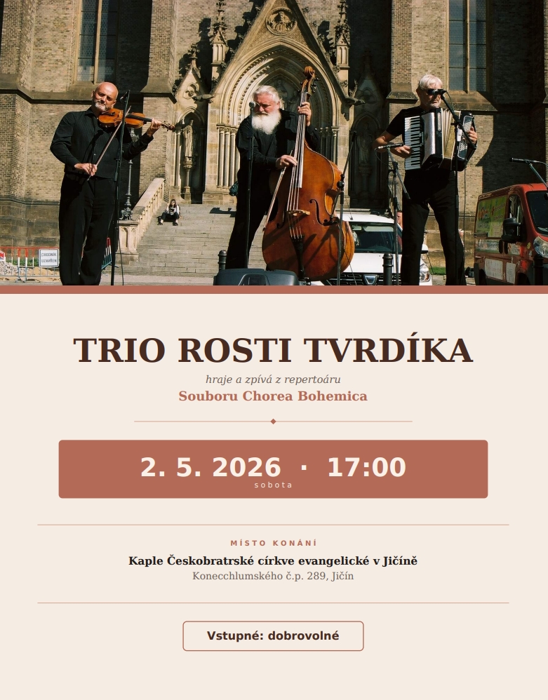 V sobotu 2. 5. 2026 od 17:00 v kapli Českobratrské církve evangelické v Jičíně, Konecchlumského č.p. 289, Jičín