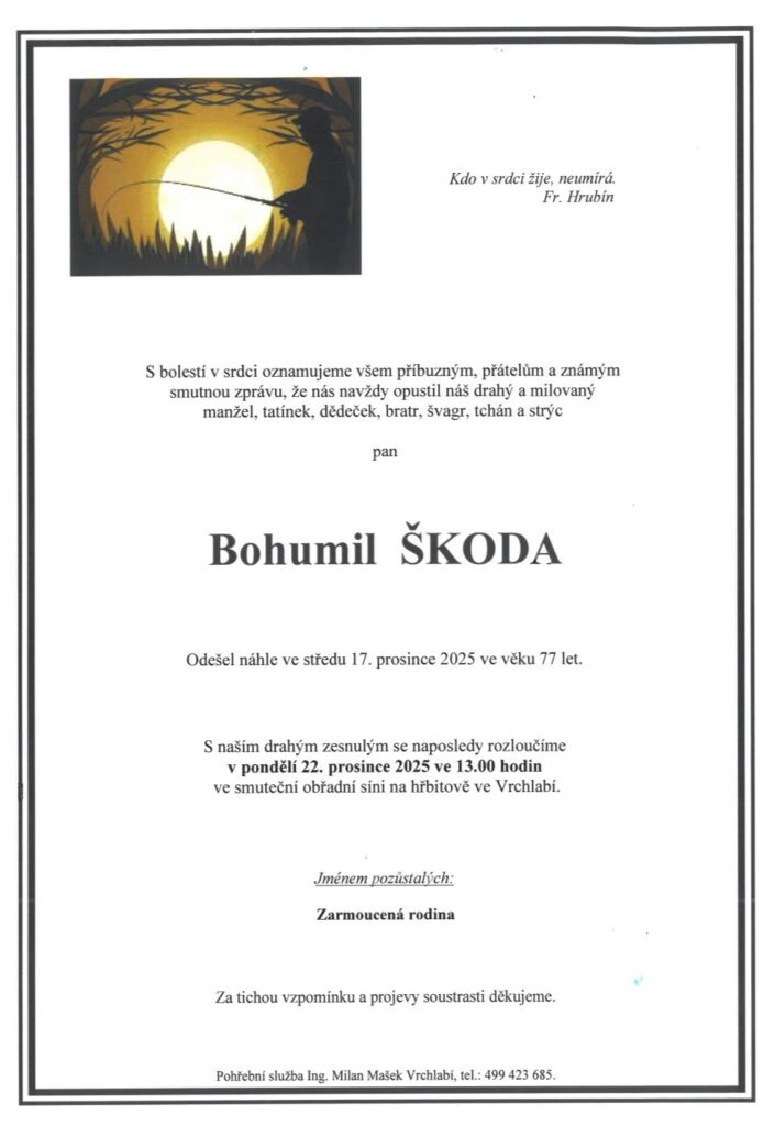 Poslední rozloučení s bratrem Bohumilem Škodou se koná v pondělí 22. prosince od 13:00 ve smuteční síni vrchlabského hřbitova.