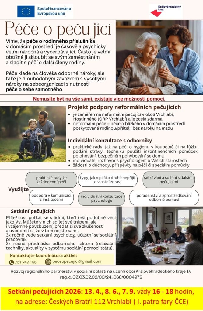 Setkání je určeno pro ty, kteří pečují o někoho blízkého ve Vrchlabí a okolí (ORP Vrchlabí). Jste vítáni na všech setkáních, účastnit se můžete klidně jen některých, jak máte čas