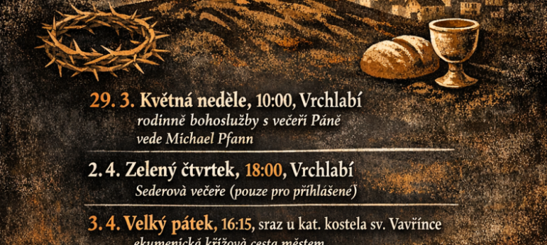 Srdečně vás všechny zveme ke společnému slavení letošních Velikonoc 29. 3. Květná neděle, 10:00, evangelický sbor Vrchlabí, rodinné bohoslužby s večeří Páně, vede Michael Pfann 2. 4. Zelený čtvrtek, 18:00, evangelický sbor Vrchlabí, Sederová večeře ve Vrchlabí (je nutné se přihlásit do 29. 3.) 3. 4. Velký pátek, 16:15, sraz…